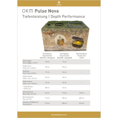 El detector de metales Pulse Nova PI de OKM proporciona un escaneo extra eficiente del suelo, detectando joyas perdidas como anillos, dijes y pendientes, oro natural como pepitas de oro, militaria como armas y municiones antiguas a profundidades de hasta 3 m (9,8 pies).